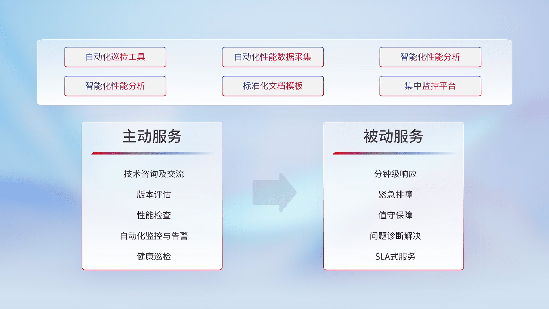智能化工具和标准化文档,,保障服务质量,,,提供主动服务(包含技术咨询、、、版本评估、、、、性能检查、、、、自动化监控与告警、、健康巡检)和被动服务包含(分钟级响应、、、紧急排障、、、、值守保障、、问题诊断解决、、、SLA服务)。。