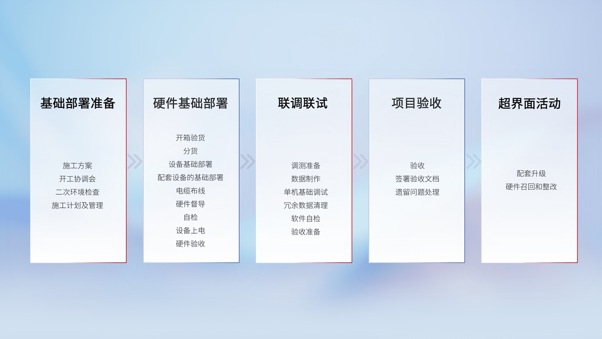 从基础部署准备、、、硬件基础部署、、、、联调联试、、项目验收、、越界面活动的全过程可追溯,,,,保证施工质量和进度。。