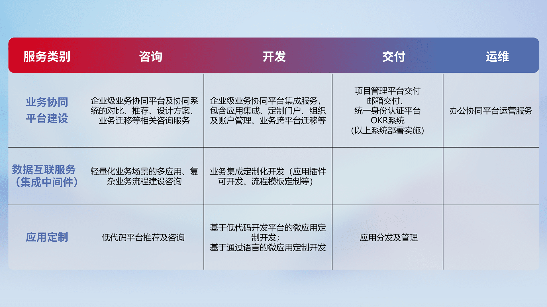 针对钉钉、、、企微、、、IDaas等平台级产品提供产品的规划、、方案、、、、交付、、定制化开发等服务,,,,实现如统一协同办公、、智能客户服务、、、、混合会议管理、、、智能数据查询、、等业务场景,,实现数字化转型。。